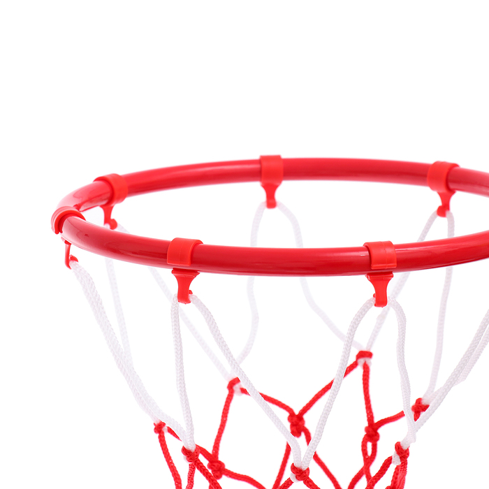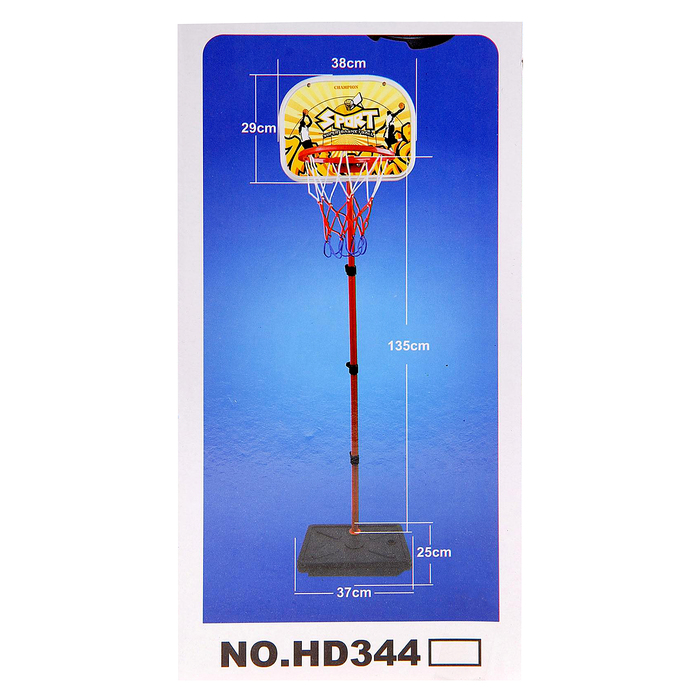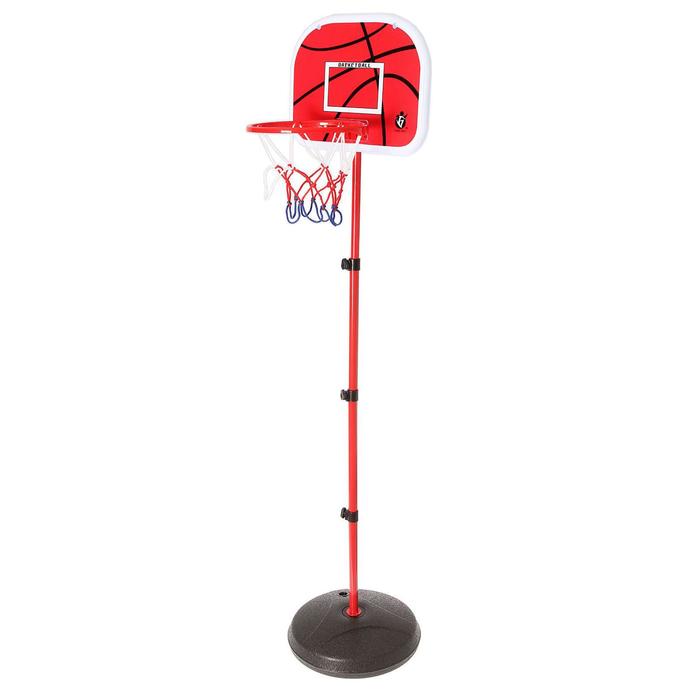 В комплект входит щит и кольцо на стойке, баскетбольный мяч подходящего размера и насос.