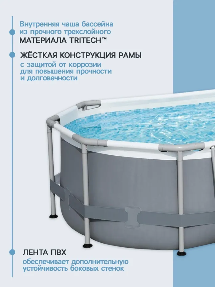 Материал бассейна выдерживает давление больших объёмов воды, повышенное сопротивление создаётся за счет гибких тройников на углах бассейна, лента ПВХ обеспечивает дополнительную устойчивость боковых стенок. Внутренняя чаша бассейна состоит из прочного трёхслойного материала TriTech™. Система соединения стальной рамы Seal & Lock ™ – для защиты от попадания воды в стрелу, чрезвычайно жёсткая конструкция рамы с защитой от коррозии повышает прочность и долговечность.