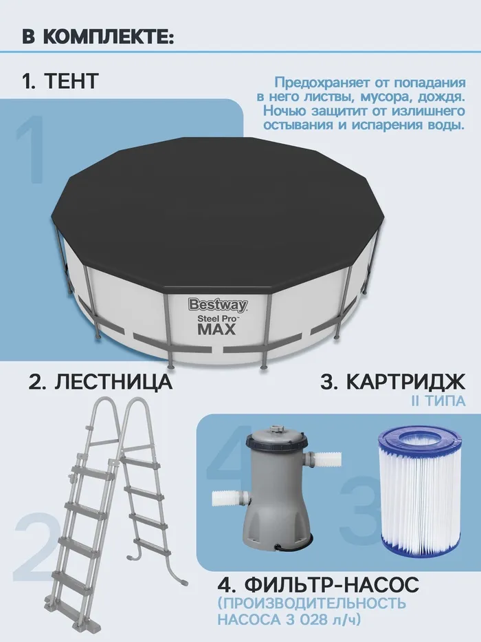 В комплекте к бассейну входят: фильтр-насос с картриджем, лестница, тент, диспенсер.
