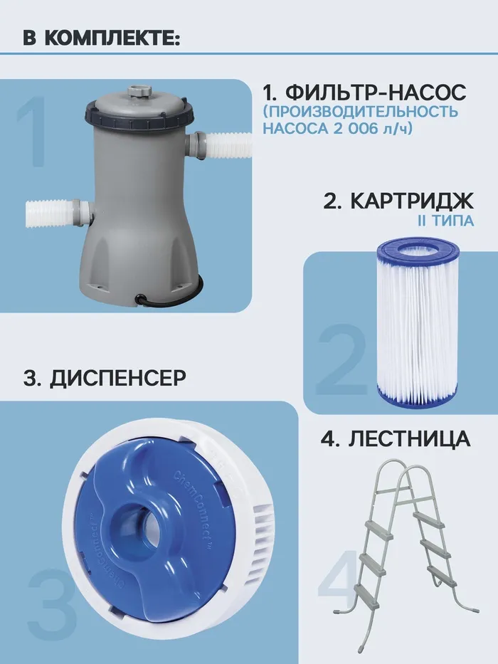 В комплекте к бассейну входят: фильтр-насос с картриджем, лестница, диспенсер.