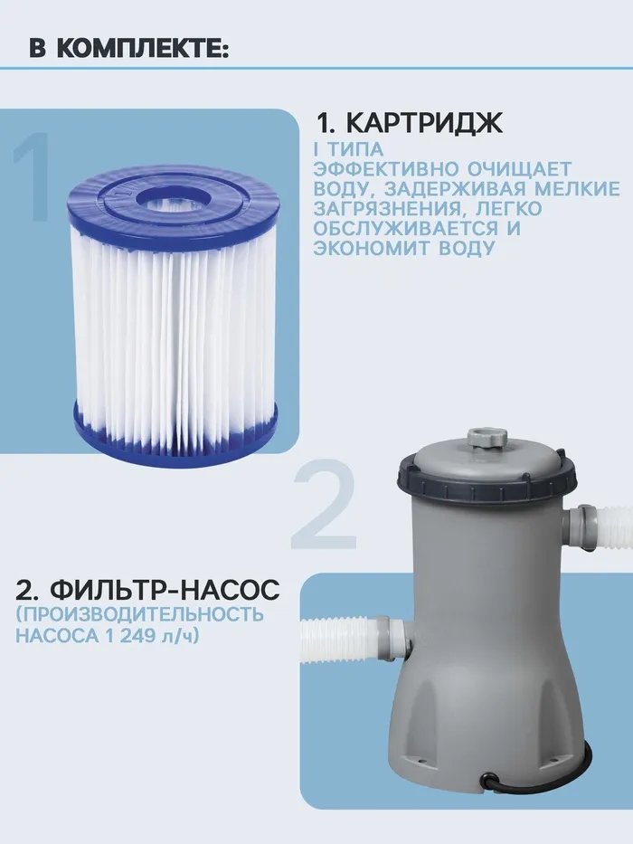 В комплекте с бассейном прилагается фильтр-насос. Тип картриджей для фильтр-насоса: «I».