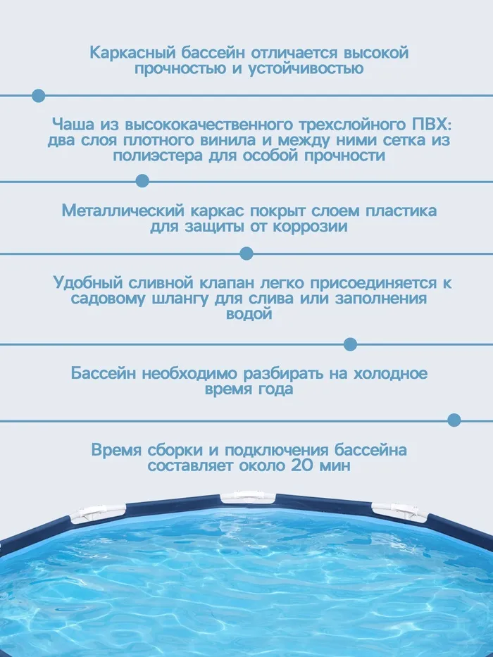 Каркасный бассейн — это отличный выбор для всей семьи. Каркас бассейна сделан из прочного металла, что позволяет выдерживать большие нагрузки. Материал бассейна выдерживает суровые погодные условия, устойчив к прямым попаданиям солнечных лучей и воздействию хлора, выдерживает давление больших объёмов воды.