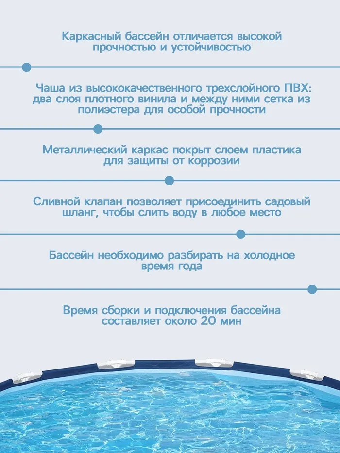 Бассейн быстро устанавливается благодаря простой системе сборки труб. Никаких дополнительных инструментов не требуется. Металлическая трубчатая конструкция удерживает давление воды в бассейне, сохраняя его устойчивость и стабильность во время использования.