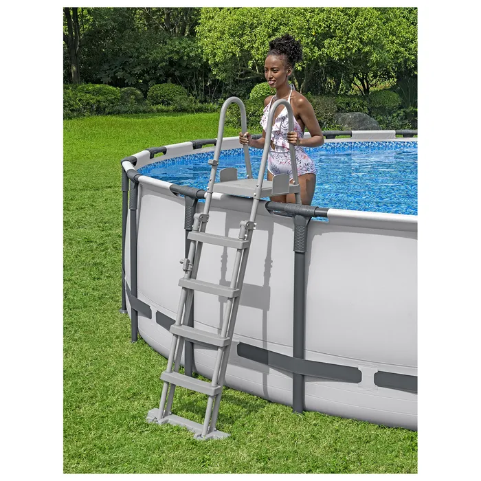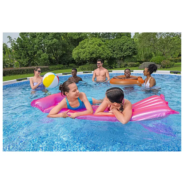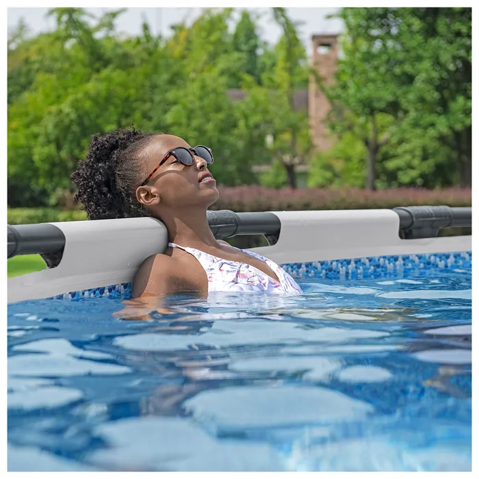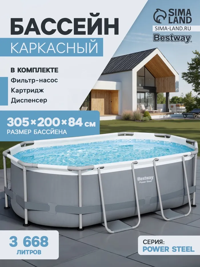 Каркасный бассейн подойдёт для размещения на придомовом участке. Основная особенность этой модели — большой размер. В таком бассейне будет комфортно плавать всей семье.