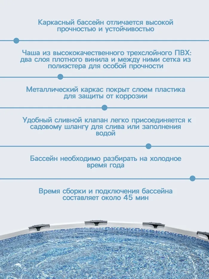 Бассейн быстро устанавливается благодаря простой системе сборки труб. Никаких дополнительных инструментов не требуется. Металлическая трубчатая конструкция удерживает давление воды в бассейне, сохраняя его устойчивость и стабильность во время использования.