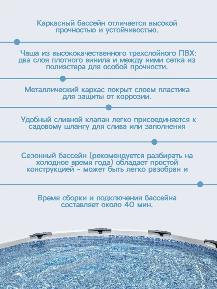 Бассейн быстро устанавливается благодаря простой системе сборки труб. Никаких дополнительных инструментов не требуется. Металлическая трубчатая конструкция удерживает давление воды в бассейне, сохраняя его устойчивость и стабильность во время использования.