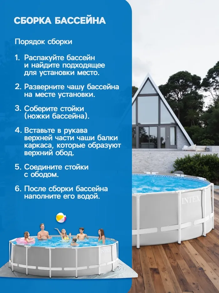 Каркасный бассейн — это отличный выбор для всей семьи. Каркас бассейна сделан из прочного металла, что позволяет выдерживать ему большие нагрузки. Материал бассейна выдерживает суровые погодные условия, устойчив к прямым попаданиям солнечных лучей и воздействию хлора, выдерживает давление больших объёмов воды.
