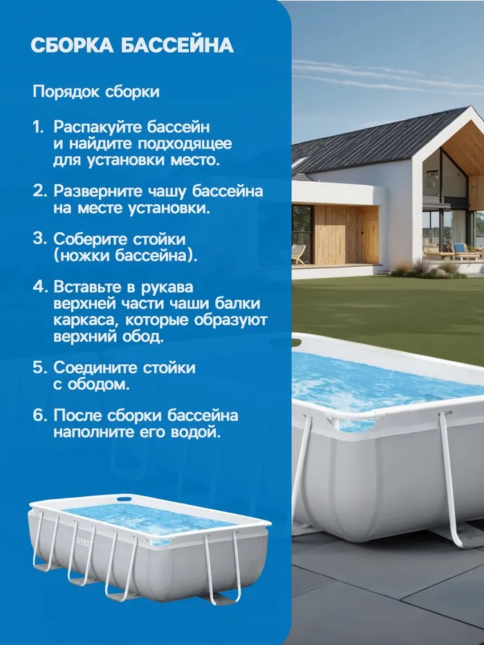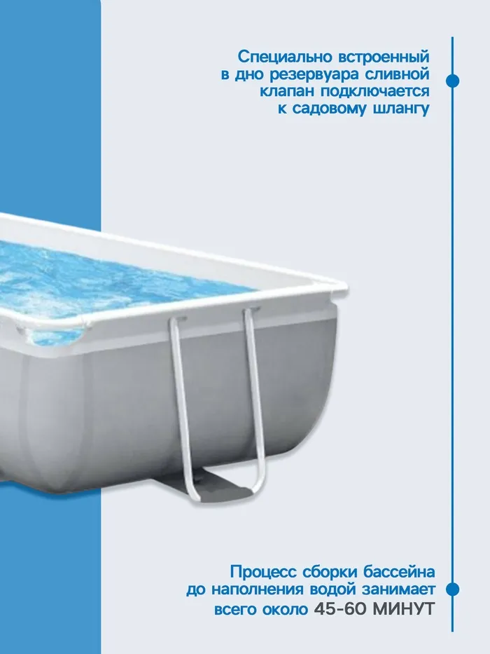 Каркасный бассейн — это отличный выбор для всей семьи. Каркас бассейна сделан из прочного металла, что позволяет выдерживать ему большие нагрузки. Материал бассейна выдерживает суровые погодные условия, устойчив к прямым попаданиям солнечных лучей и воздействию хлора, выдерживает давление больших объёмов воды.