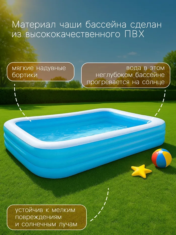 Детский бассейн — это незаменимый элемент летнего отдыха на природе, который создаст атмосферу праздника у вас во дворе. В жаркий день дети будут купаться, брызгаться и играть в нём. Классический дизайн подойдёт для участка в любом стиле. Объёмные бортики позволяют удобно облокотиться на них, а малыши могут с лёгкостью перелезать через мягкие стенки.