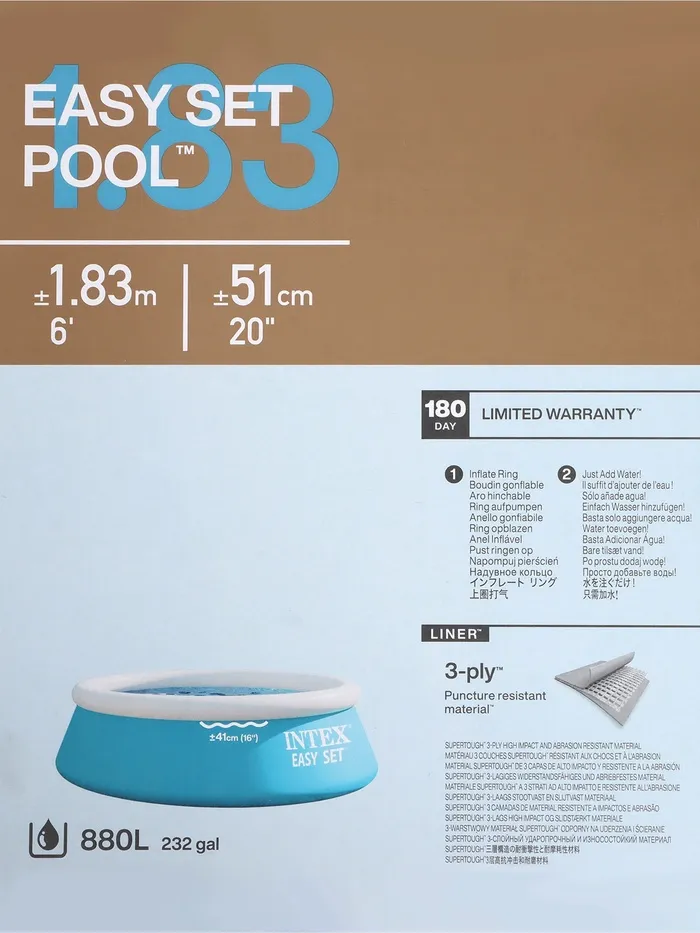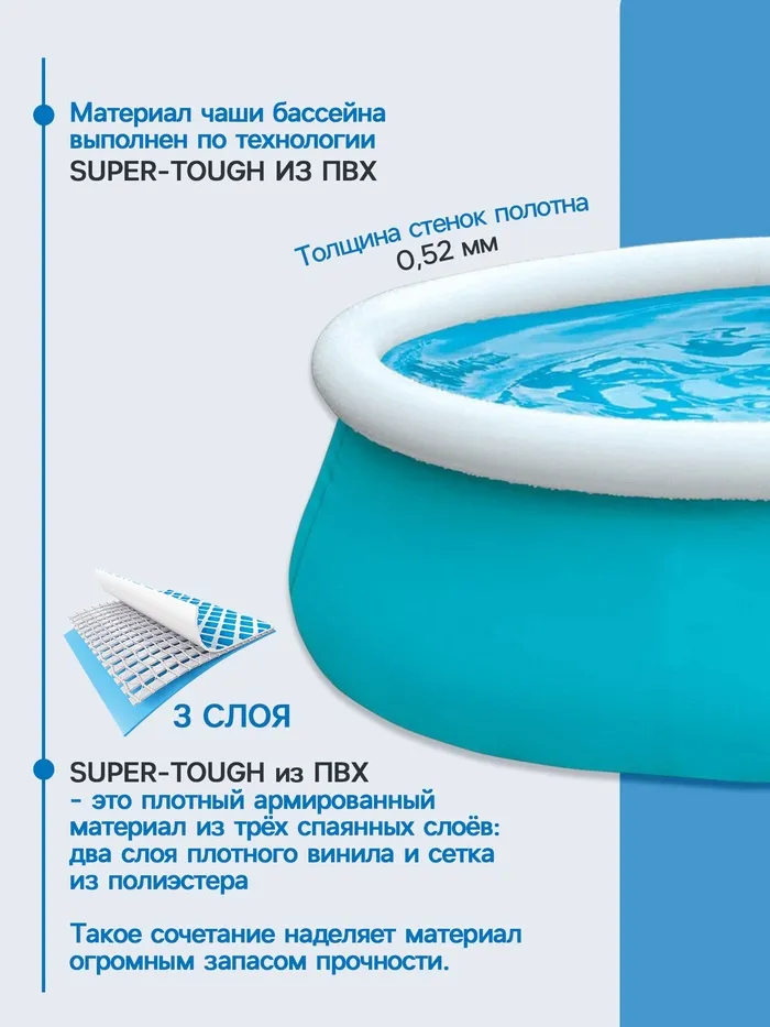 Запатентованная технология SUPER-TOUGH обеспечивает надежность бассейна. Стенки бассейна изготавливаются из трех отдельных слоев: два слоя сделаны из плотного винила, третий слой - из особо прочного полиэстера. Благодаря небольшой глубине этот бассейн прекрасно подходит для купания родителей вместе с детьми. Дети старше 3 лет могут купаться в этом бассейне самостоятельно.