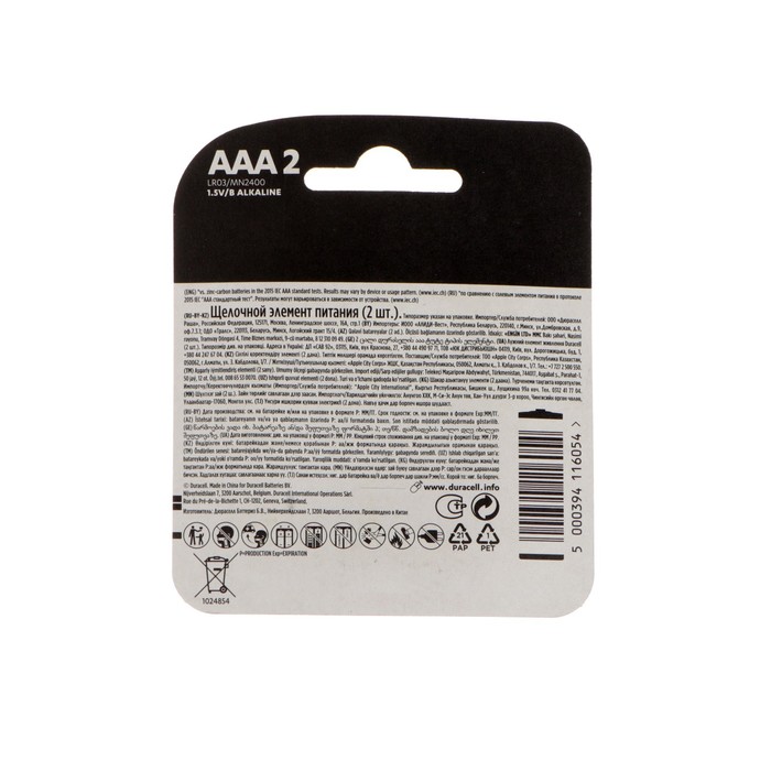 Батарейка алкалиновая Duracell Basic, AAA, LR03-2BL, 1.5В, блистер, 2 шт. — Характеристики