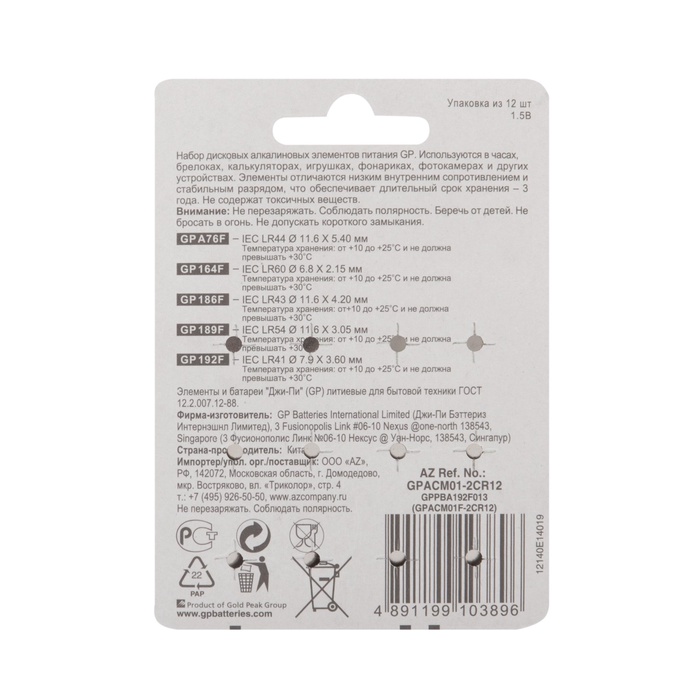 Батарейка алкалиновая GP, ACM01-12BL (А76 по 4 шт; 164. 186, 189, 192 по 2 шт.); 1.5 В, 12 шт. — Характеристики