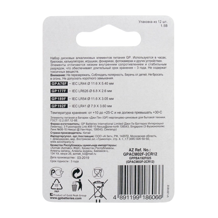 Батарейка алкалиновая GP, ACM02F-12BL (А76 по 4 шт; 164.186.189 192 по 2 шт.); 1.5 В, 12 шт. — Характеристики