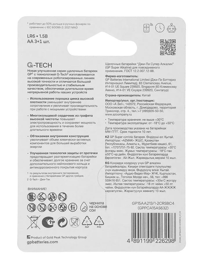 Все батарейки торговой марки GP сертифицированы согласно российскому стандарту ГОСТ и международным стандартам ISO9001 и ISO14001.