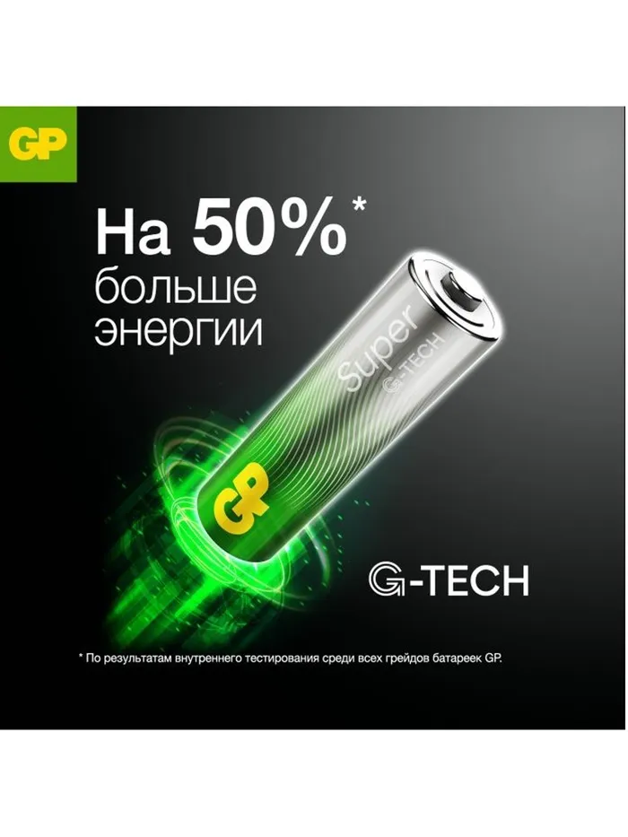 Новая линейка батареек GP Super Alkaline с технологией G-TECH, которая обеспечит до 50%* больше мощности, позволяя вам наслаждаться использованием ваших устройств без перерывов. Технология G-TECH гарантирует длительное время службы ваших устройств. Благодаря использованию графита высокой чистоты и высококачественного порошка цинка S, батарейки обеспечивают высокую мощность и стабильное напряжение на протяжении продолжительного времени.