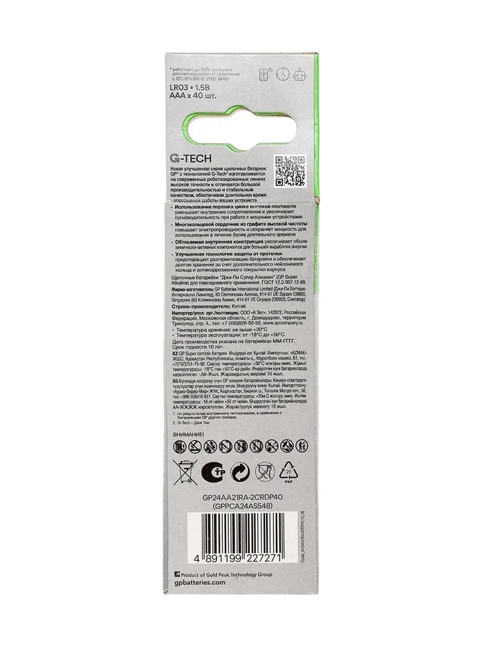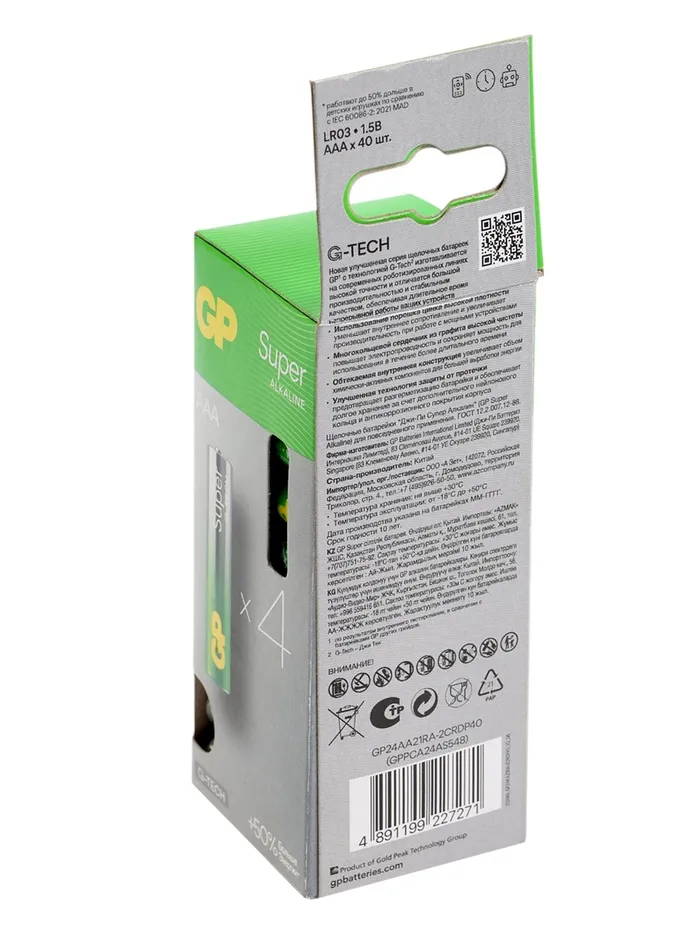 Батарейка алкалиновая GP Super, AAA, LR03-40BOX, 1.5 В, набор 40 шт. — Характеристики