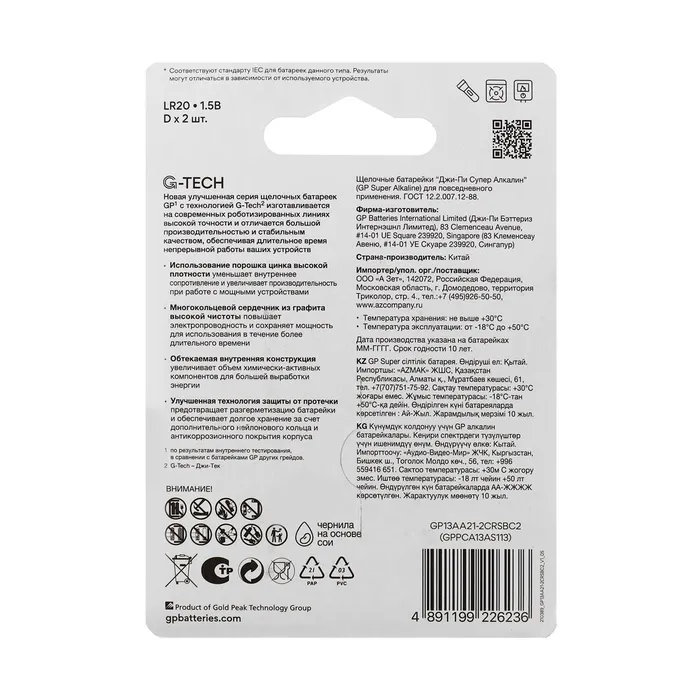 Батарейка алкалиновая GP Super, C, LR20-2BL, 1.5В, блистер, 2 шт. — Характеристики