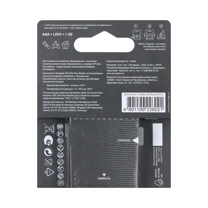 Батарейка алкалиновая GP Ultra Plus Alkaline G-tech, AAA, LR03-4BL, 1.5В, блистер, 4 шт. — Характеристики