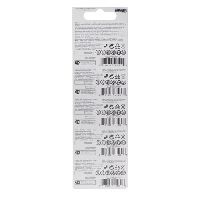 Батарейка алкалиновая Kodak, AG4 (G4, 377, LR626, LR66)-10BL, 1.5 В, блистер, 10 шт. — Характеристики
