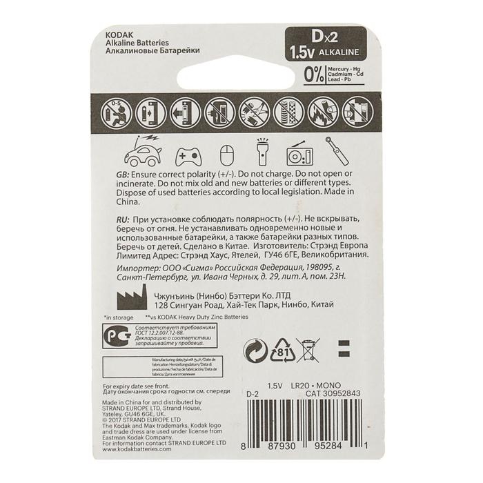 Батарейка алкалиновая Kodak Max, D, LR20-2BL, 1.5В, блистер, 2 шт. — Характеристики