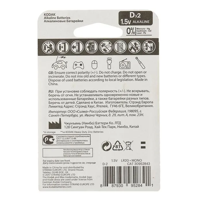 Используйте щелочные элементы питания (LR20) с любыми устройствами: от тех, которые не создают долговременных и интенсивных нагрузок, до потребляющих значительный ток. Срок хранения составляет от 3 до 5 лет.