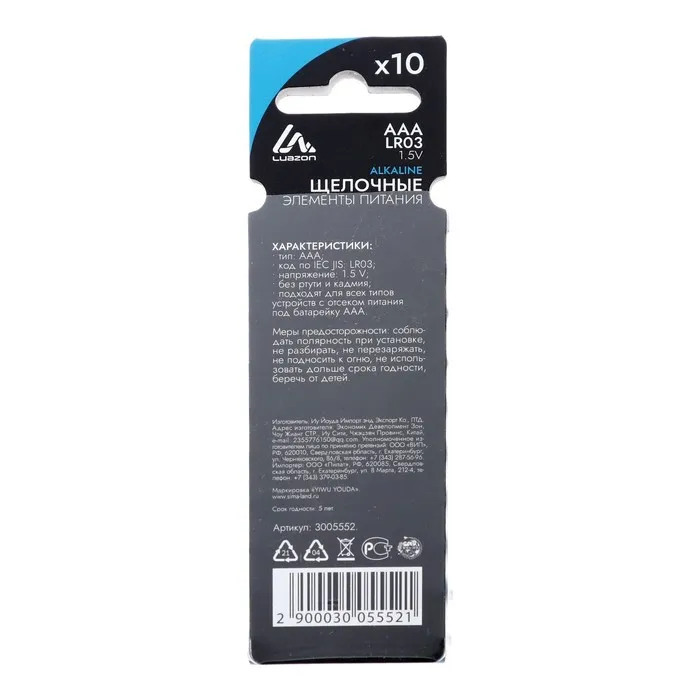 Батарейка алкалиновая (щелочная) Luazon, AAA, LR03, блистер, 10 штук — Характеристики