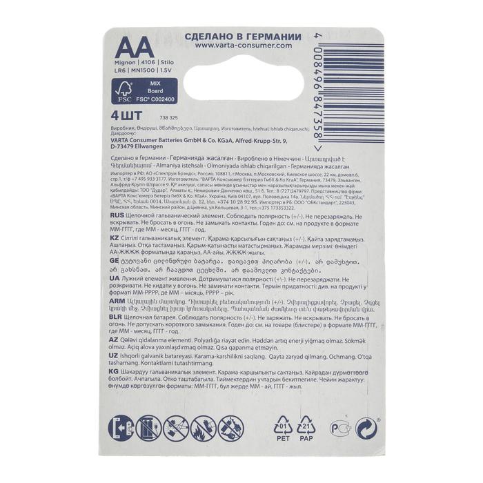 Батарейка алкалиновая Varta Energy, AA, LR6-4BL, 1.5 В, блистер, 4 шт.