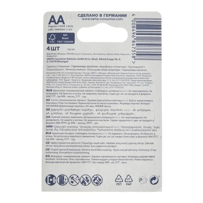 Батарейка алкалиновая Varta Energy, AA, LR6-4BL, 1.5 В, блистер, 4 шт. — Характеристики