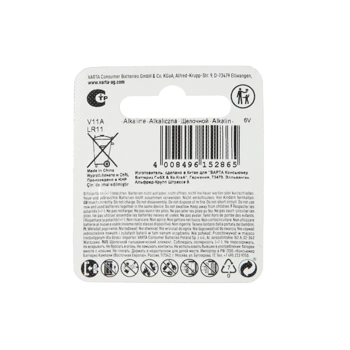 Батарейка алкалиновая Varta, LR11 (A11/MN11) - 1BL, 1.5В, блистер, 1 шт. — Характеристики