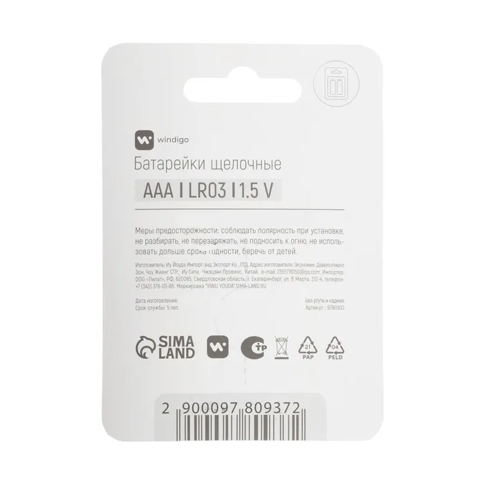 Батарейка алкалиновая Windigo, AAA, LR03, блистер, 2 штуки — Характеристики
