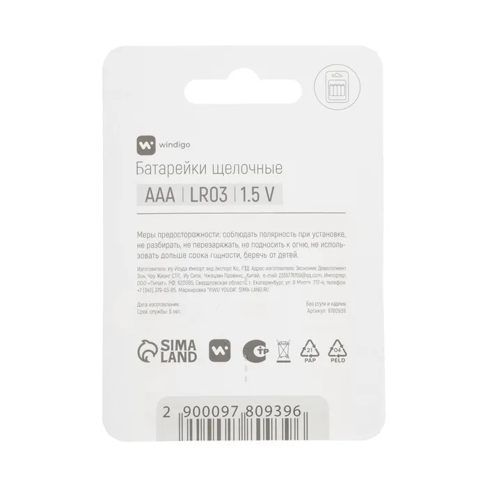 Батарейка алкалиновая Windigo, AAA, LR03, блистер, 4 штуки — Характеристики