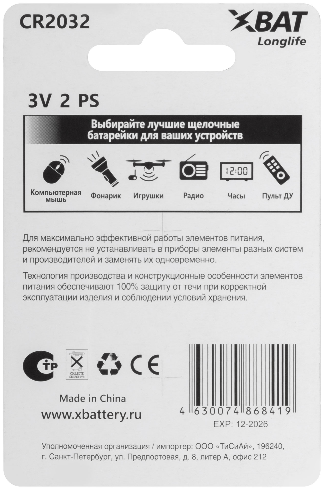 Выберите литиевые батарейки CR2032 от XВАТ, чтобы обеспечить надежное и долговечное питание ваших устройств.
