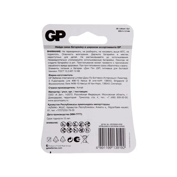 Батарейка литиевая GP, CR2032-2BL, 3В, блистер, 2 шт. — Характеристики
