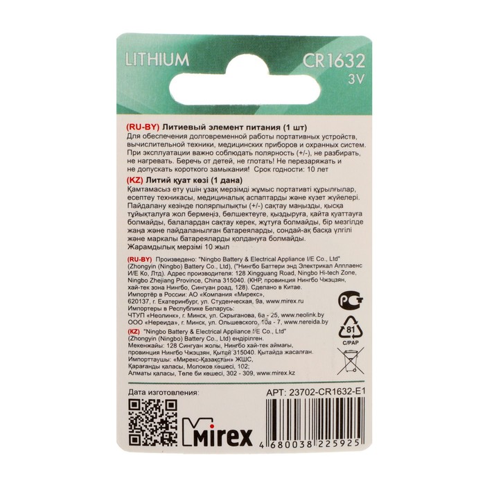 Батарейка литиевая Mirex, CR1632-1BL, 3В, блистер, 1 шт. — Характеристики
