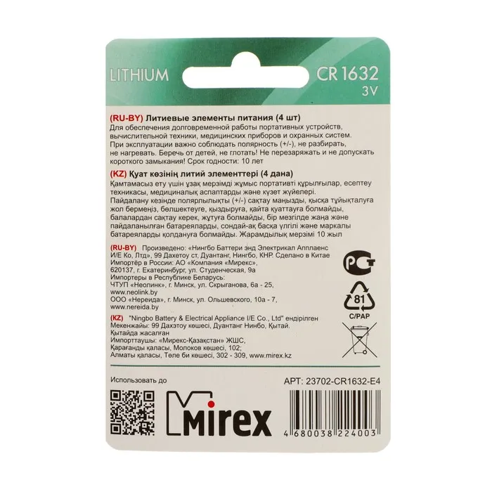 Батарейка литиевая Mirex, CR1632-4BL, 3В, блистер, 4 шт. — Характеристики