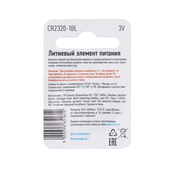 Батарейка литиевая "Трофи", CR2320-1BL, 3В, блистер, 1 шт. — Характеристики