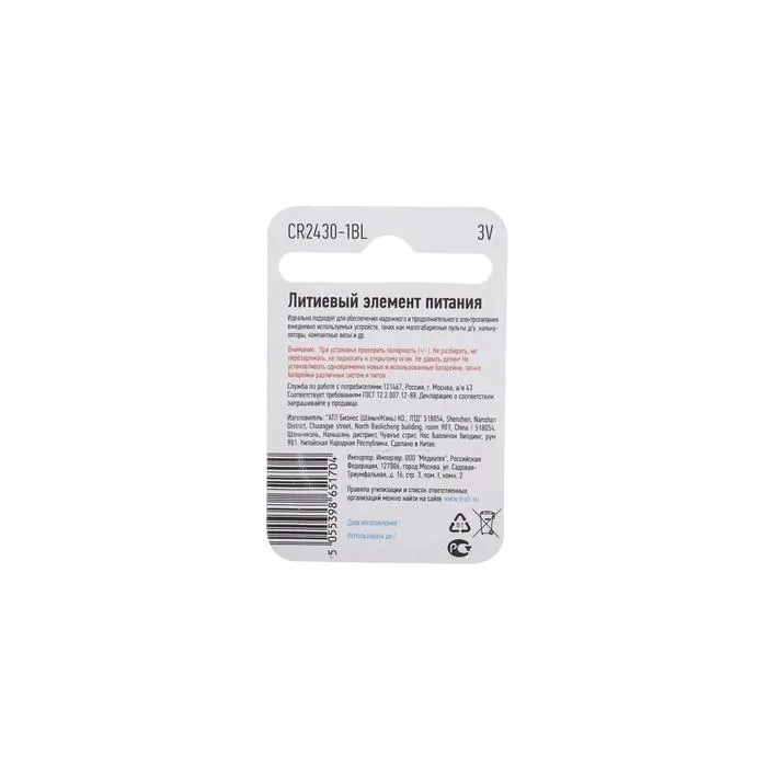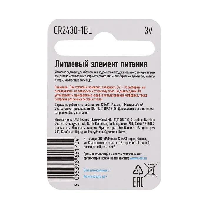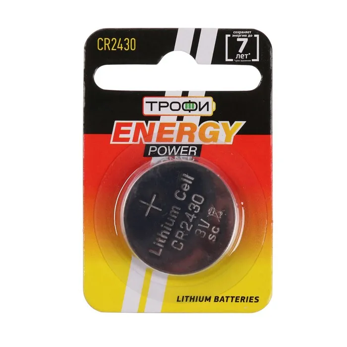Батарейка литиевая "Трофи", CR2430-1BL, 3В, блистер, 1 шт. — Характеристики