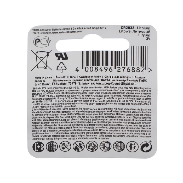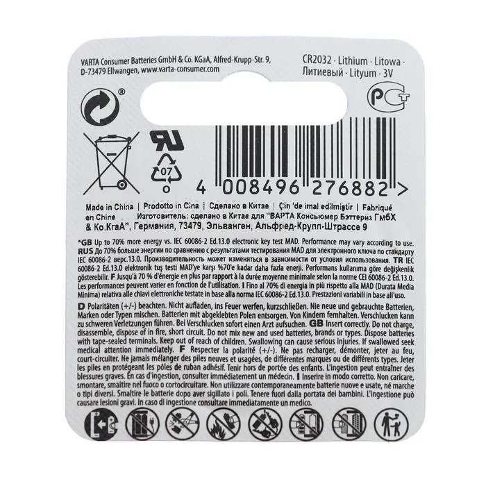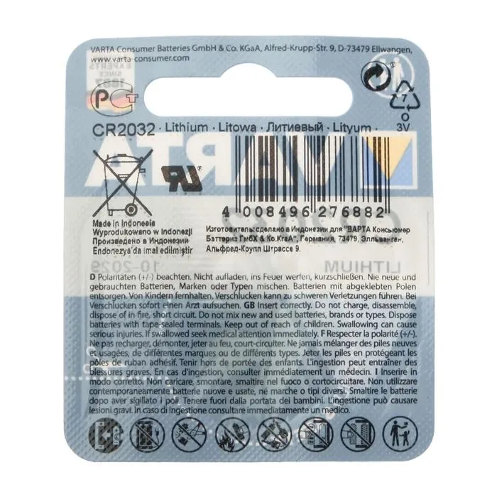 Батарейка литиевая Varta, CR2032-1BL, 3 В, блистер, 1 шт. — Характеристики