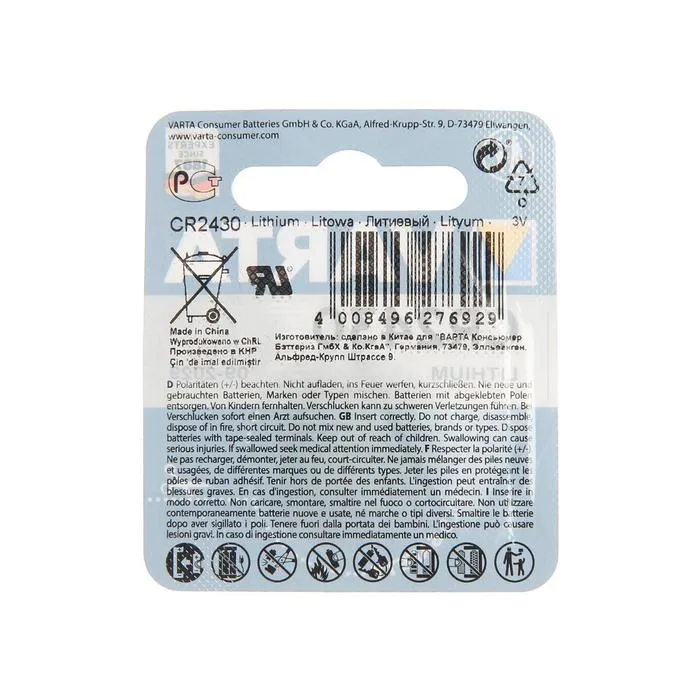 Батарейка литиевая Varta, CR2430-1BL, 3В, блистер, 1 шт. — Характеристики