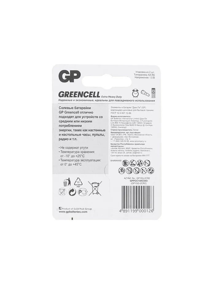 Солевой тип батарей GP не содержит тяжелых металлов, таких как ртуть и кадмий. Источники питания являются экологически чистым продуктом, безопасным для эксплуатации в бытовых условиях, а также для окружающей среды в процессе утилизации и переработки по окончанию срока службы.