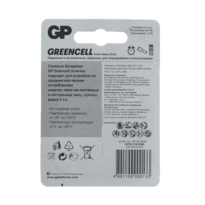 Батарейка солевая GP Greencell Extra Heavy Duty, AA, R6-4BL, 1.5 В, блистер, 4 шт. — Характеристики