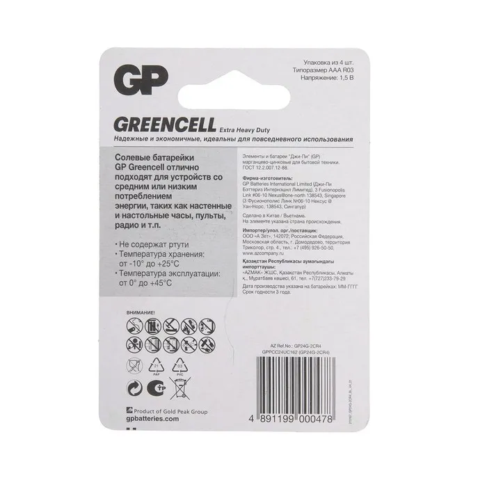 Батарейка солевая GP Greencell Extra Heavy Duty, AAA, R03-4BL, 1.5В, блистер, 4 шт. — Характеристики