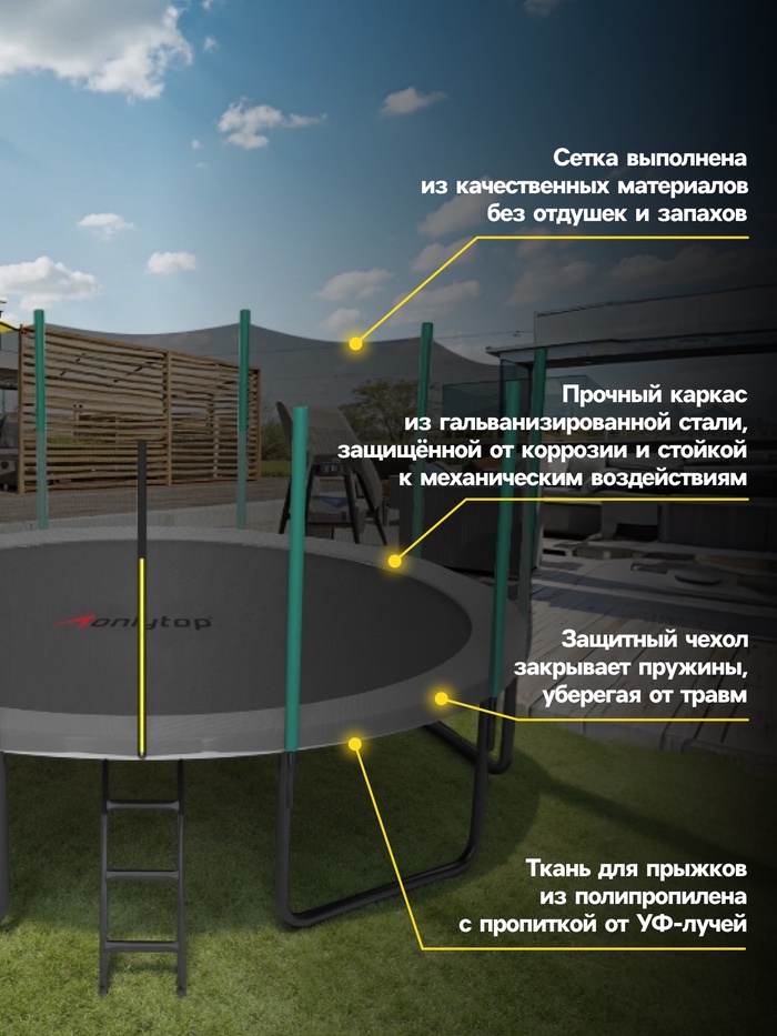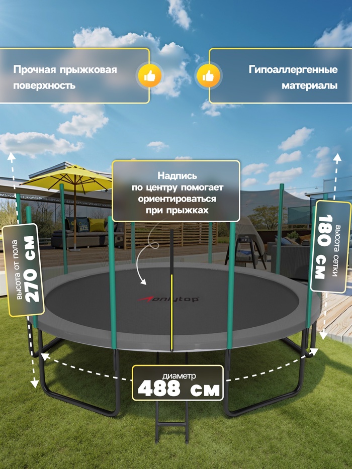 Батут ONLITOP, d=488 см, высота сетки 180 см, с лестницей — Характеристики