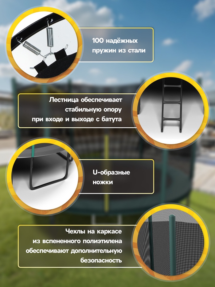Батут подойдёт для размещения на придомовом участке. Металлический каркас изделия обеспечивает устойчивость и безопасность при использовании.