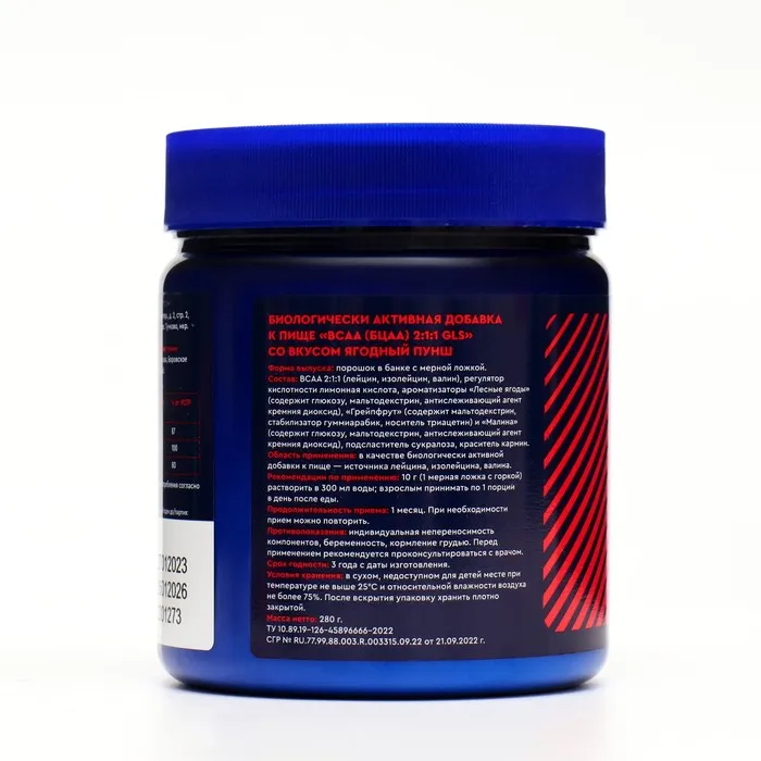 Состав: 10 г порошка содержат: L-лейцин — не менее 4 г; L-изолейцин — не менее 2 г; L-валин — не менее 2 г. Вспомогательные вещества: регулятор кислотности лимонная кислота, ароматизаторы «Лесные ягоды» (содержит глюкозу, мальтодекстрин, антислеживающий агент кремния диоксид), «Грейпфрут» (содержит мальтодекстрин, стабилизатор гуммиарабик, носитель триацетин) и «Малина» (содержит глюкозу, мальтодекстрин, антислеживающий агент кремния диоксид), подсластитель сукралоза, краситель кармин.
