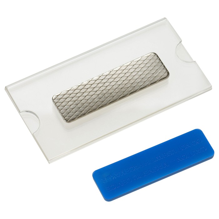 - Магнитное крепление: Две сильные неодимовые магнитные пластины надежно фиксируют бейдж с двух сторон ткани. Это бережет вашу одежду от проколов и повреждений.