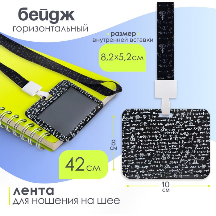 Бейдж горизонтальный, внешний размер 100×80 мм, внутренний размер 52×82 мм, на ленте 42 см, «Формулы»
