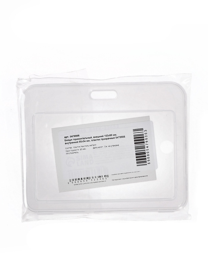 Бейдж горизонтальный, внешний 103×80 мм, внутренний 85×54 мм, пластик прозрачный — Характеристики