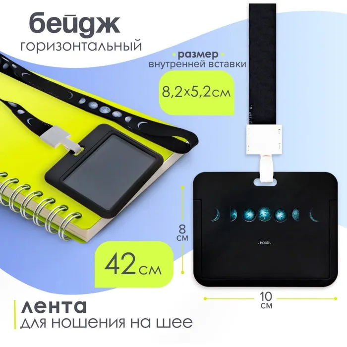 Бейдж горизонтальный, внешний размер 100×80 мм, внутренний размер 52×82 мм, на ленте 42 см, «Луна» — Характеристики