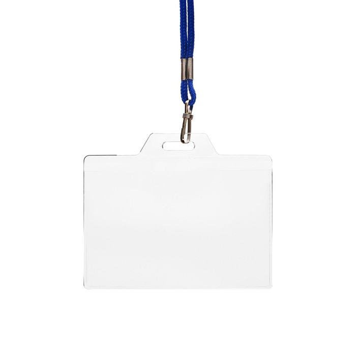Бейдж горизонтальный, внешний размер 94×80 мм, внутренний размер 87×54 мм, на синем шнурке 40 см — Характеристики